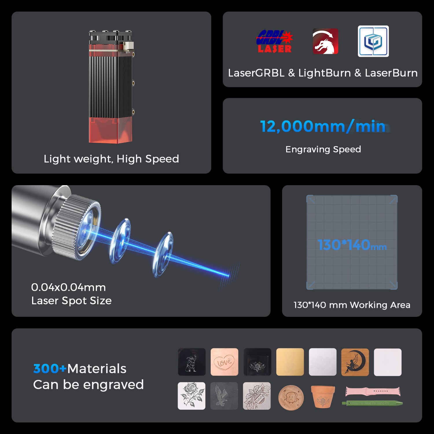 Avec une puissance optique d'environ 2,5 W, cet outil est clairement destiné à la gravure et aux applications de découpe très légères. Son format compact est conservé, mais son boîtier le rend nettement plus silencieux, mieux protégé et plus adapté à un usage quotidien .