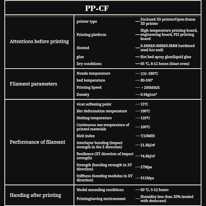 PP-CF-Filament ist ein speziell entwickeltes, kohlenstofffaserverstärktes Polypropylenfilament. Es wird aus einem speziell formulierten Polypropylen-Copolymer hergestellt, das mit hochmoduligen, gehackten Kohlefasern verstärkt ist. Dieses Filament basiert auf einer zum Patent angemeldeten Formulierung, die im Vergleich zu PP-basierten Verbindungen der Konkurrenz verbesserte thermische Eigenschaften und geringe Schrumpfung/Verzug bietet. -