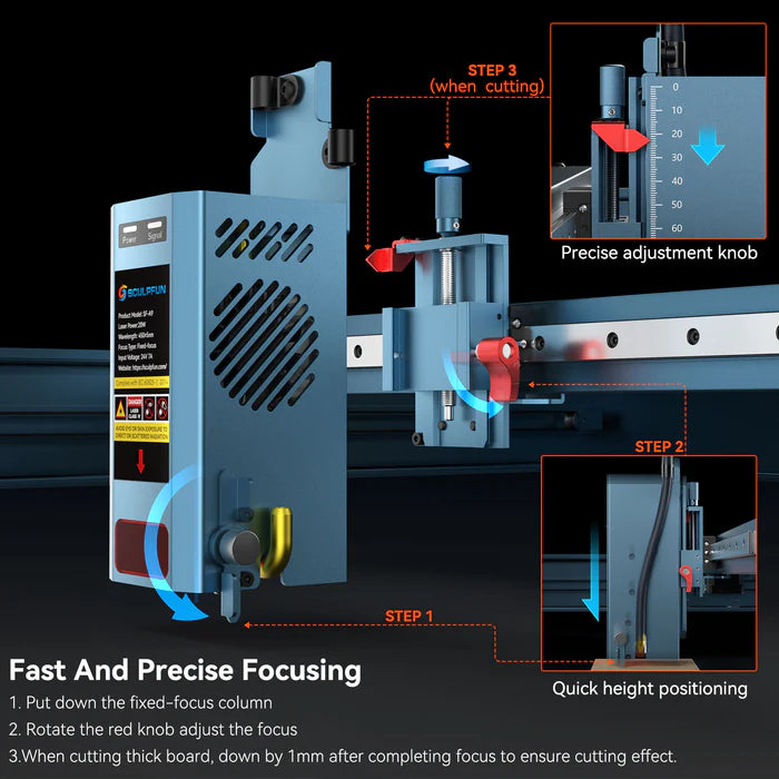 4. Präzises Fokussystem: Der Fokushebel am Laserkopf ist stabil montiert und ermöglicht eine exakte Fokusposition. Mit dem roten Drehknopf an der rechten Seite lässt sich die Höhe des Lasermoduls grob an das Material anpassen; der obere Drehknopf dient zur Feinjustierung.